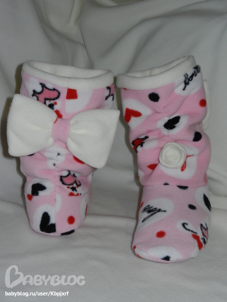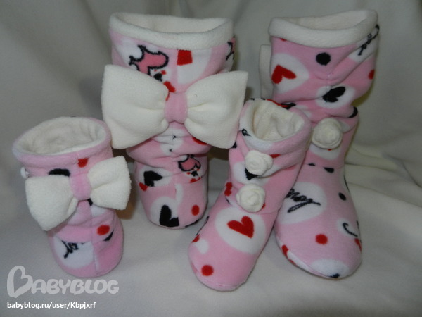 Шитье одежды, выкройки, ремонт одежды, шторы, швейные машины (уже приобретенные)Сначала покажу комплектик " маме и доченьке". Наподобе такого уже шила. Этот комплект сегодня отправился в Москву на ул. Голубинская. Двойнос флис без утеплителя, стелька: ватин + утеплитель, розочки из флиса, бант из флиса внутри банта для удержания формы- синтепон.