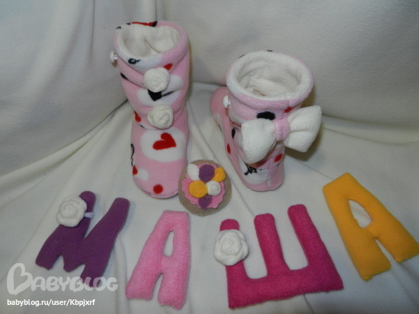 Эти тапульки для Машульки 3 лет. Плюс буквы для имени из флиса, две белые резиночки розочки из флиса и (посмотрите между сапожек) пирожное для кукол -тоже из флиса.