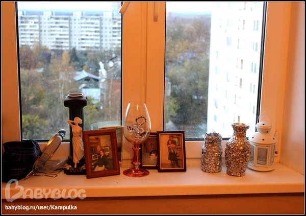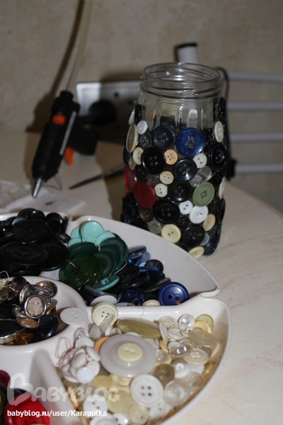 Декор, витражи.Имелась обычная стеклянная банка и ещё ваза невзрачная, белая с голубыми цветочками. А так же много пуговиц, клеевой пистолет и серебристая аэрозольная краска. Превратилось всё это в элементы декора))
