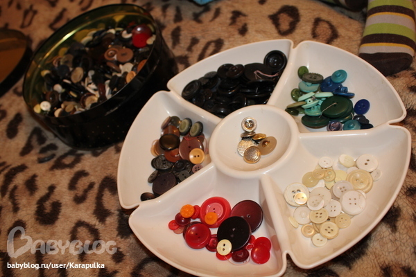 Ну и ребёнку удаётся иногда с моим богатством поиграть - сортировать по цветам, составлять из пуговиц буквы,иногда даже картинки, а красивые экземпляры выпрашивать и утаскивать в свои тайники))))
