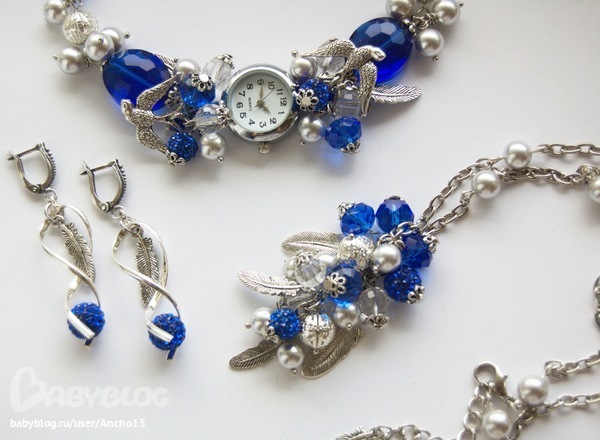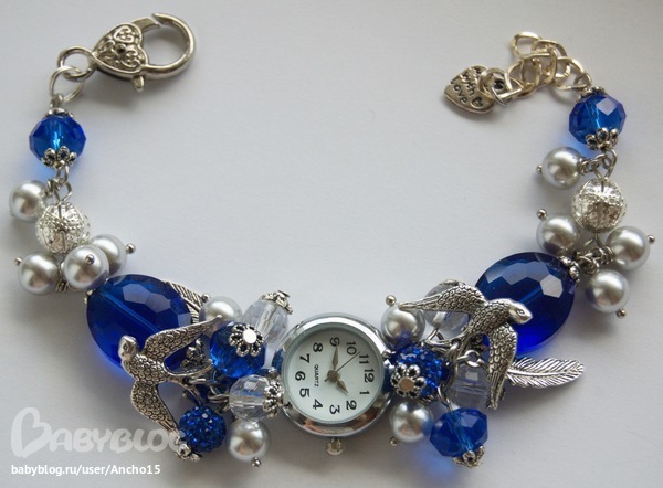 Комплект выполнен из кварцевой часовой основы, гранёных бусин, стразовых бусин, металлических бусин, жемчуга майорка и фурнитуры под серебро.