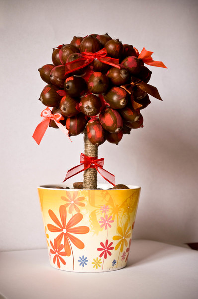 сначала свормировали шарик из газеты, обклеили его малярным скотчем (чтобы форму держал), а внизу сделали отверстие для палочи (у нас карандаш) и начали обклеивать желудями с помощью клеевого пистолета. потом обмотали ножку веревкой. дальше в горшок на дно положили еще газету, так же обклеенную малярным скотчем с дыркой для карандаша (для устоичивости в горшке. а после этого залили в горшок гипс. - это первый этап.