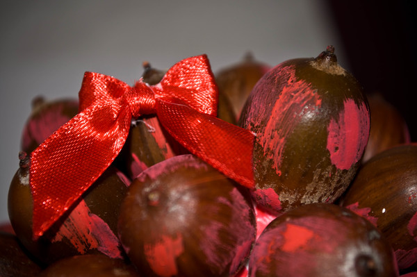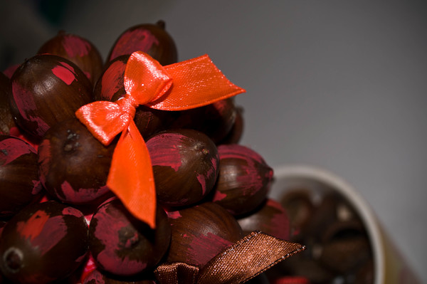 2 этап - декор: гипс замоскировали шляпками от желудей (так же с помощью пистолета клеевого). кусочки белого шара я закрасила краской (зря, сейчас поняла что надо сначала закрашивать шар (еще без желудей), а поом уже обклеивать желудями. красить лучше из баллончика, думаю. немоного подкрасили желуди. у нас акриловая краска, но я не довольна. как-то блекло. а после этого наелали бантики на вилке (есть МК в игнете, если не знаешь) ну и наклеить в произвольном порядке