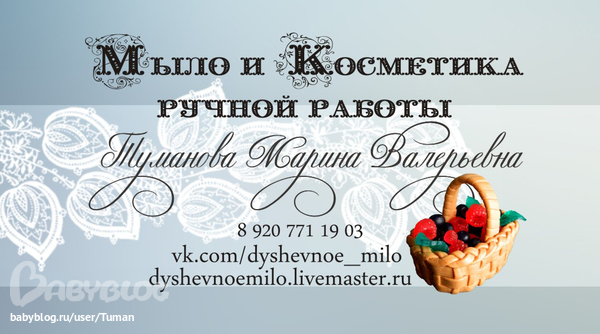 Мыло и косметика своими рукамиДевчата, мы когда-то обсуждали визитки, что и как там должно быть. Не могу найти этот пост, подскажите, где он, если кто помнит.