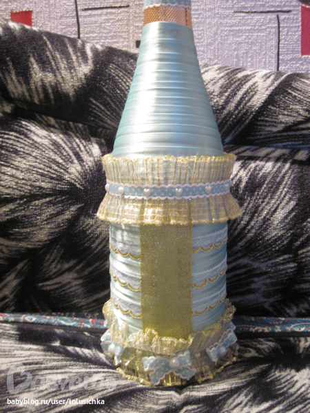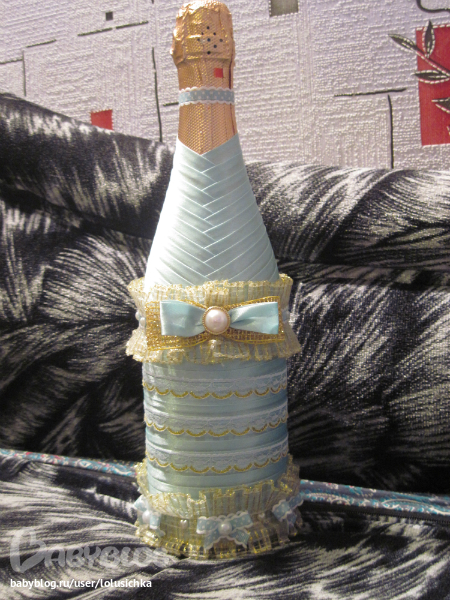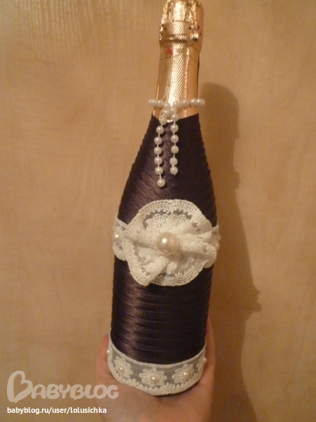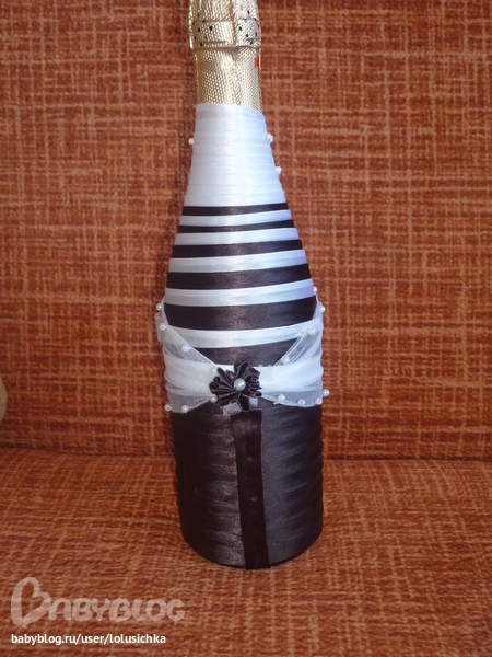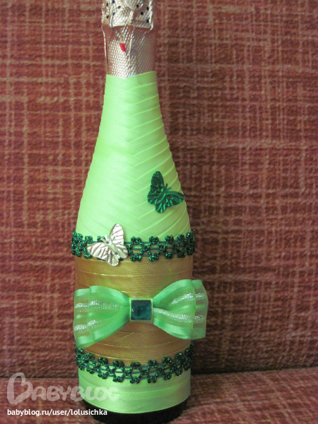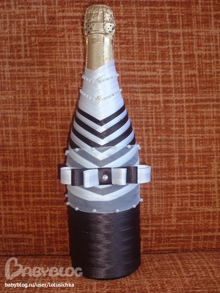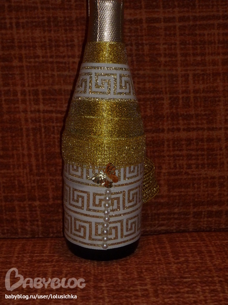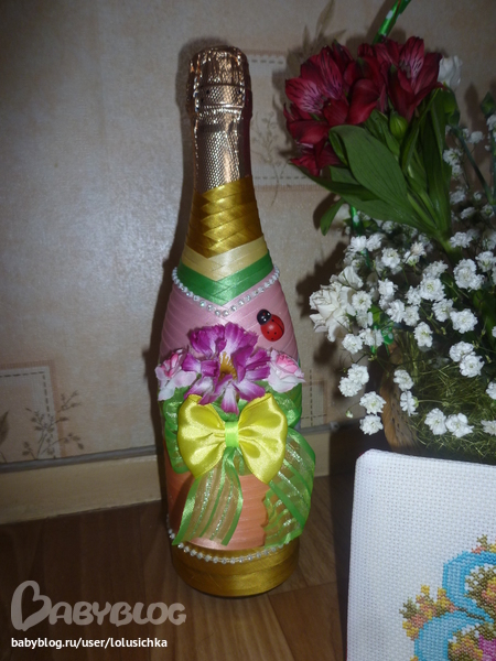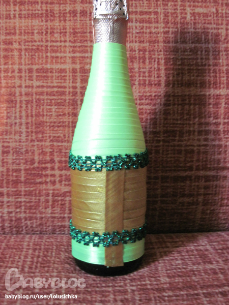 Декор, витражи.Здравствуйте, рукодельницы! В этом разделе пишу 1 раз, надеюсь, что не последний. Попробовала я оборачивать лентами шампанское и вот что получилось: