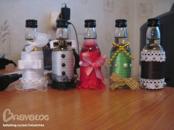 ну и как теперь пить с этих бутылок,ты подумала??? жалко ж выкнуть будет такую нарядную "тару" теперь. Если будешь в будущем еще что-то подобное делать,то выбирай не шампанское и /или ординарное(недолгосрочное) вино, а такие спирт.напитки, чтоб потом люди хранили и любовались,а лет эдак через 30-40 выпили)