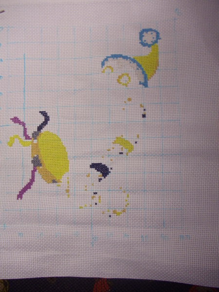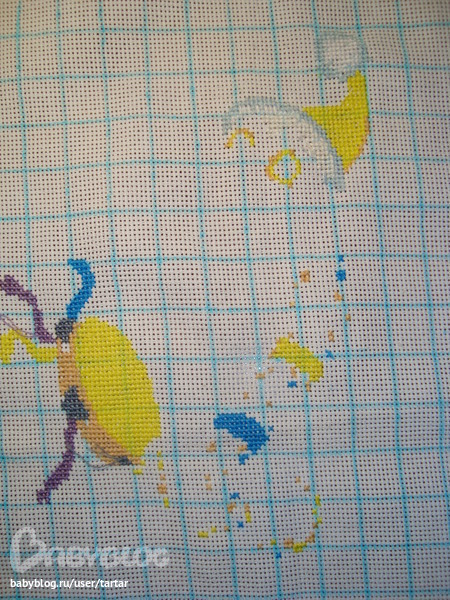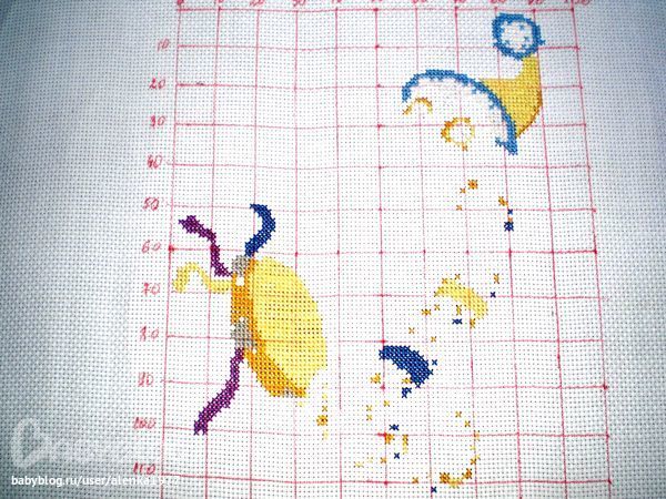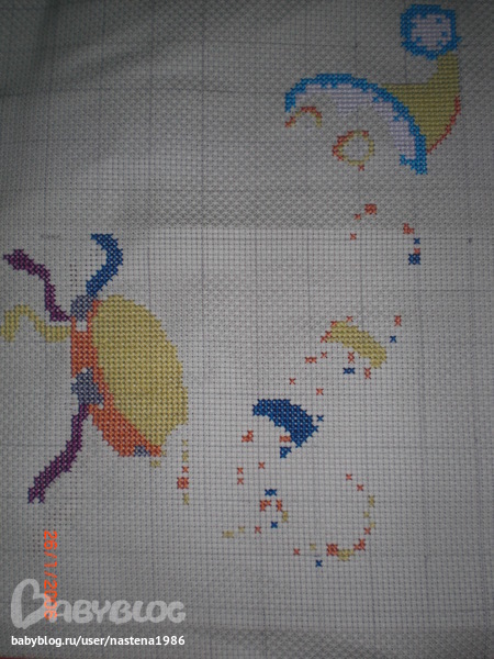 Вот и я добралась до интернета. Поскольку канва голубая, голубые ниточки на ней практически не видны были, и я взяла одну голубую, одну блескучую. Вот что получилось. Строго не судите, косяков много, исправлять дети не дают(((