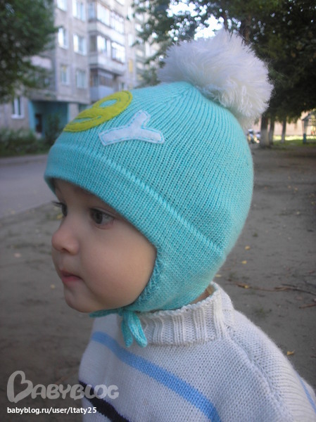 Шапочка связана на вязальной машине, с большим помпоном на макушке и аппликацией "Boy"