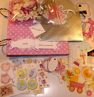 вырубка, наклейки, натирки 9переводные картинки), декоративные эдлементы из фетра, чипборд, кружево, лента, брадсы, ок.12 отрезов бумаги для подложек под фотографии, бумажные цветы, картинки для вырезания, цифры для обозначения месяцев (1-12), вощёный шнурок, полужемчуг, стразики, бордюры.