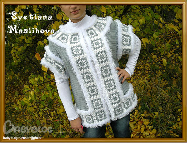 Связала для свекрови, в качестве модели моя сестрёнка, жилет ей немного великоват, ну какую модель поймала, ту и сфотографировала. Пряжа Вита Бриллиант и травка, ушло 200г белой, 400г серой и 200г травки, крючок №1,7, размер жилета 50-й. Модель жилета придумана мной, описания нет, использовала мотив "Бабушкин квадрат" и самую обыкновенную сетку столбиками с накидом.