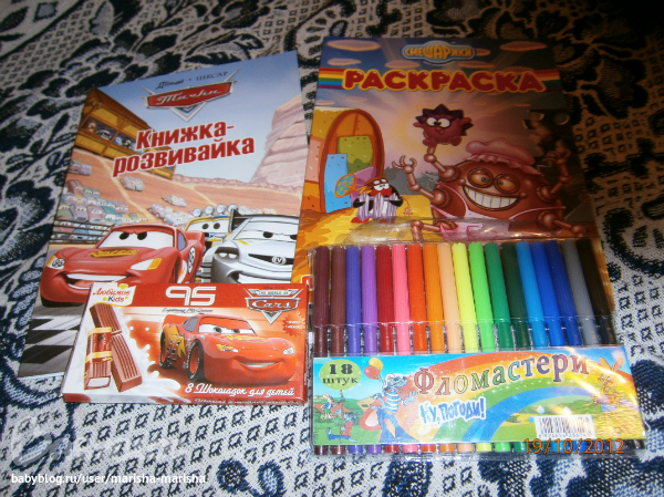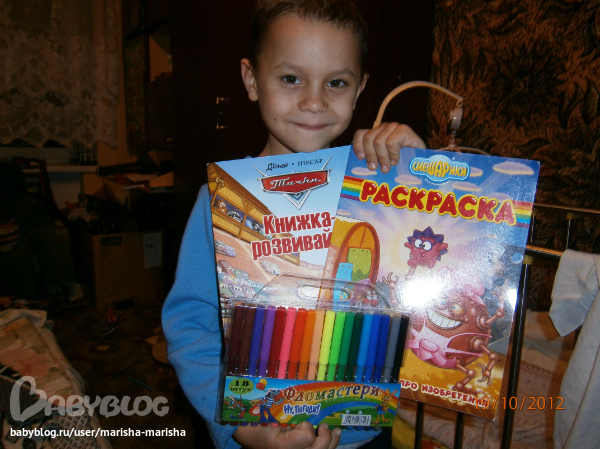 для Илюшки замечательные разукрашки, фломастеры и сладости, одну коробочку шоколадок он съел не дойдя до дома.