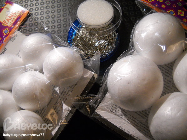 а еще я купила пенопластовые шарики для тэмари и для шишек в технике "артишок". ну и булавочки-гвоздики прикупила. осталось тряпочек поискать в закромах и ленточки подобрать.