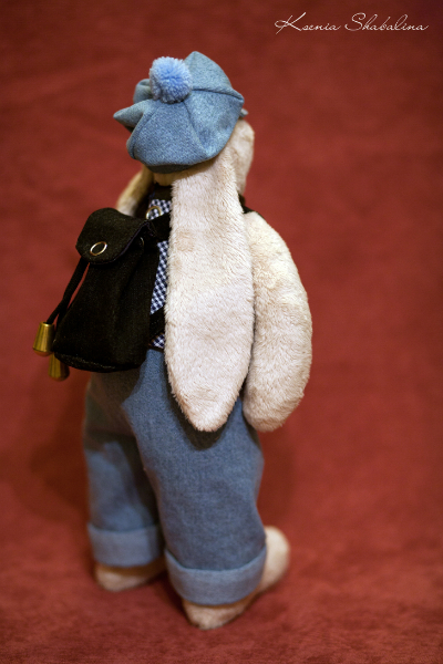 Кролик Кларк. Нитянопуговичное крепление, вся одежда съёмная, действующий рюкзак, в котором лежит маленький мишка. Рост кролика 33 см.
