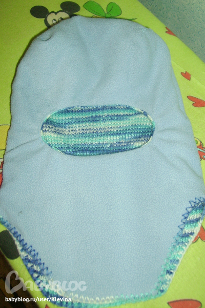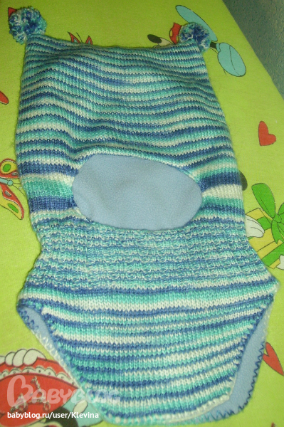 Далее вручную петельчатым швом сшила из флиса подклад, не вырезая дырку для лица. Швы флиса, что бы не давили на головушку разметала швом зигзаг - тоже вручную (нет у меня машинки с трикотажными швами, а обычная строчка будет рваться при натягивании). Ушки у флисового подклада я срезала и зашила (т.к. хотела, что бы на шапочке ушки висели, если хотите что бы ушки стояли как у бельчонка - не срезайте их с подклада, а вставьте одни в другие). Вставила сшитый подклад в основу. Одела мужу на руки, он растянул (резинка в области шеи стягивает и не дает точно совместить без растягивания), обвела дырочку для лица на подкладе, вырезала. Совместила сначала верхнюю часть с изнанки и прошила тем же стебельчатым швом, вывернула, вставив подклад в основную часть. Снизу соединила и тоже сшила. Примерила - дырочка оказалась слегка великовата. С изнаночной части подстянула немножко шов, примерила еще раз - подошло. Расправила подклад, сколола булавочками по окружностям внизу. Отрезала лишний флис. Обвязала по низу основной ниткой заточенным крючком столбиком без накида. Отпарила.