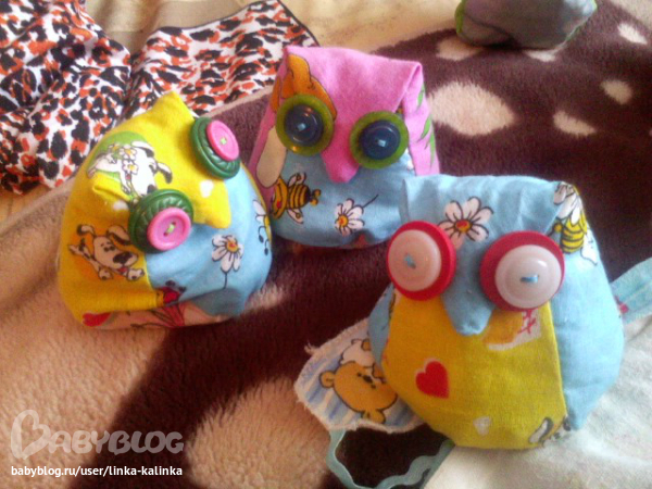 В одном - пакет+гречка+вата, в другом - фасоль+пакет+вата, третий - вата+бубенчик(купила в рыболовном магазине