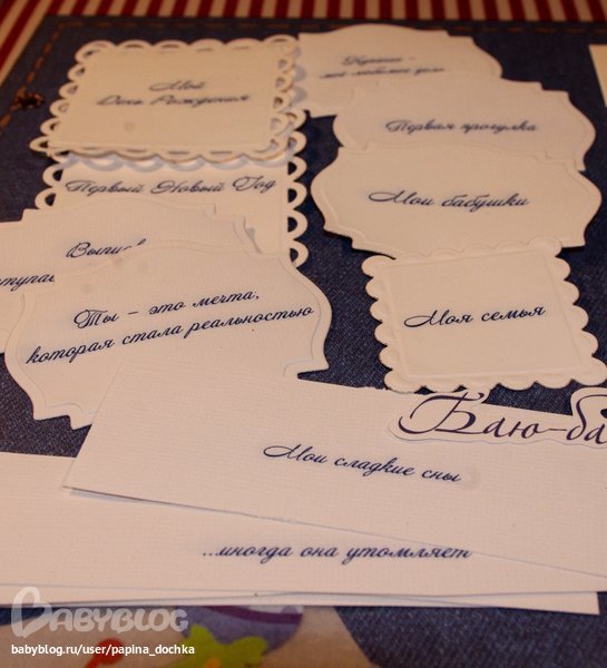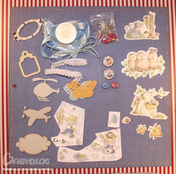 В набор входит заготовка + обложка и бумага для форзацев, кольца, люверсы, белые и голубые жемчужинки, цветы, брадсы, фигурки из чипборда, металлическая подвеска, 3 вида лент, вощёный шнурок, контурные наклейки, обычные наклейки, вырубка из фетра, натирки, пуговицы, вырубка из бумаги, надписи, в т.ч. надписи на вырубке, картинки для вырезания, бумага для подложек под фото.
