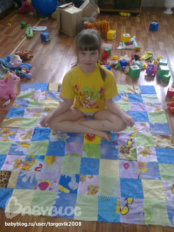 Ей интересно было выбирать ткань,искать рисунок,составлять.Одеялко у нас вышло 10*10 с одной стороны,и с другой соответственно.Пусть проявит фантазию.Вы ей дайте задание,сделать квадратики,а потом вместе сошьете.Вы же можете не шить такое большое,а сшить для кукол.