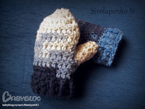 Схемки нет - вязала на глаз. Сначала вязала резиночку: вогнутый (западающий) столбик с накидом - крючок с накидом вводят не в петлю основания, а проводят его перед столбиком предыдущего ряда, захватив рабочую нить, провязывают столбик с накидом. Выпуклый столбик с накидом: Крючок с накидом вводят за столбиком предыдущего ряда и провязывают столбик с накидом. Потом вязала столбиками с накидом кругу два рядочка, в третьем оставляю дырочку для пальчика в 5 петель. И где-то на высоте шести рядов начала делать убавки: один рядок два столбика-два провязанных вместе, и два последних ряда - каждые два столбика провязаны вместе. потом присоединила нить к дырочке и вязала пальчик по такому же принципу до нужной высоты.