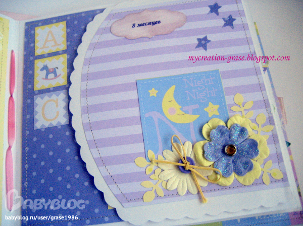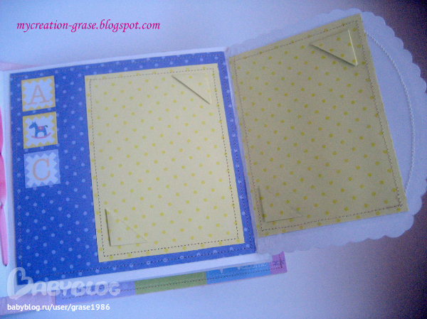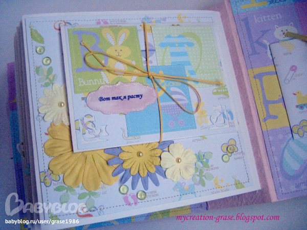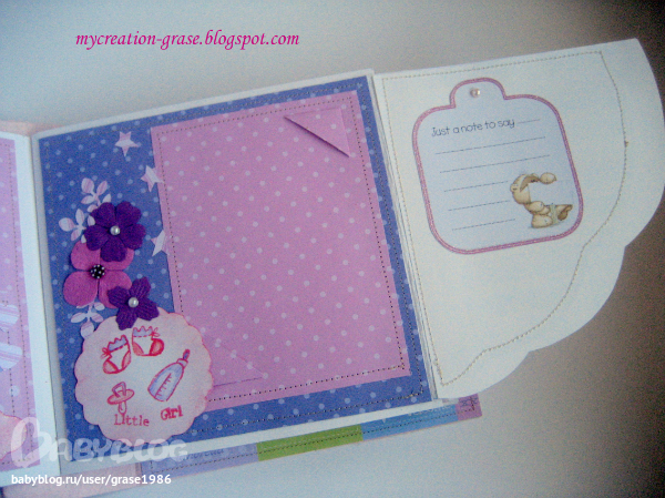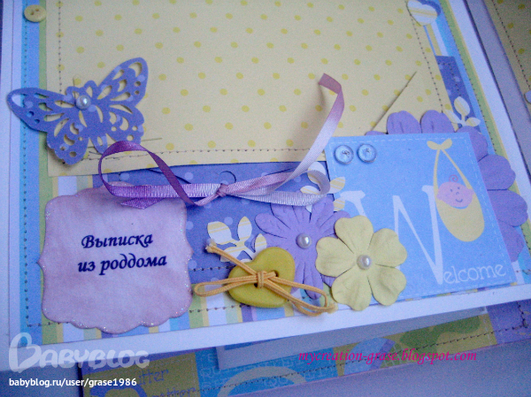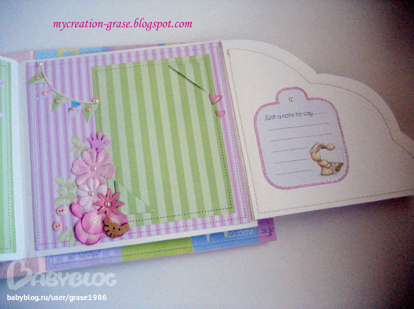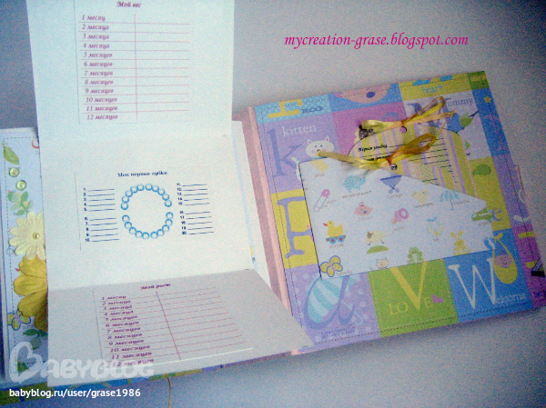 И последний разворот - страничка с книжечкой для записи параметров (вес, рост, зубки) и форзац с кармашком, в кармашке теги, в которые можно записать первые успехи малышки (там есть соответствующие графы, чет не сфоткала я эти теги отдельно)