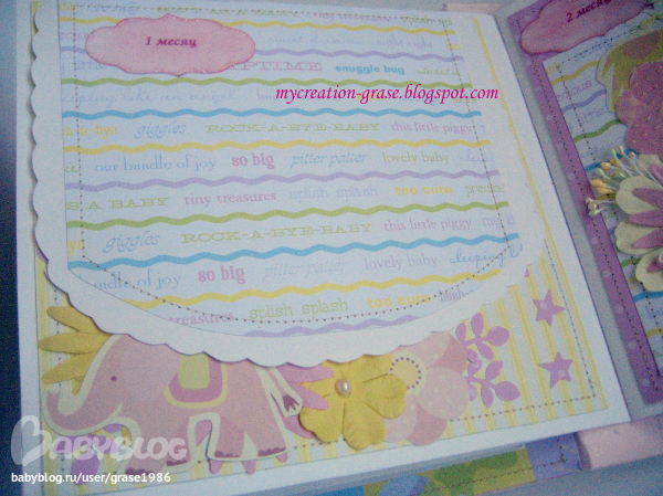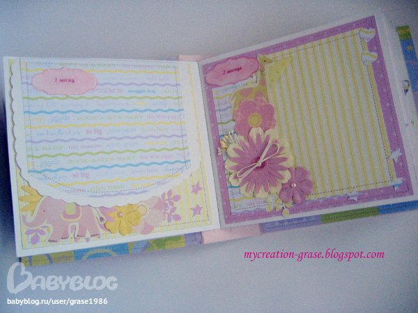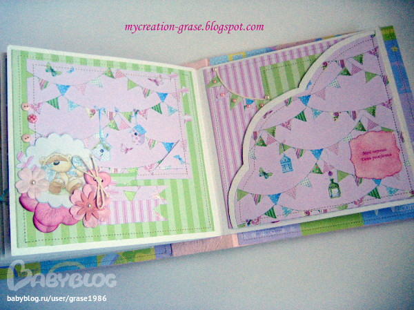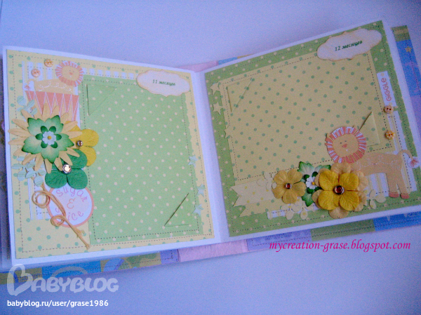 И последний разворот про первый День рождения Анютки, тоже непрактичное облачко справа - без подложки, но с тегом для записи (поздравления от мамы и папы, например))