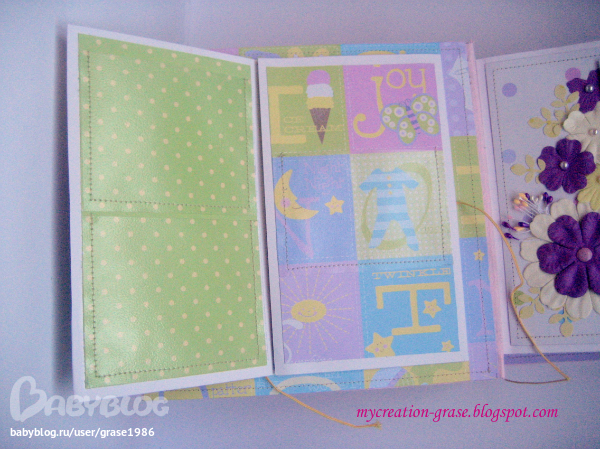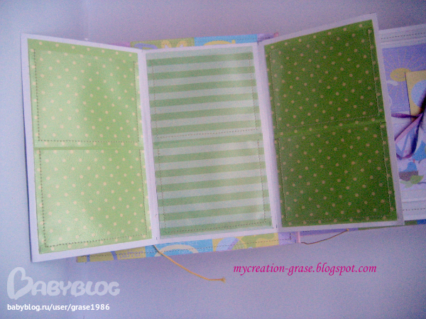 На форзаце надо было уместить 7 (!) кармашков для УЗИ-фото, долго я думала, как их компактно разместить - решила уместить их в книжечку, на следующих двух фото видно, как они размещаются