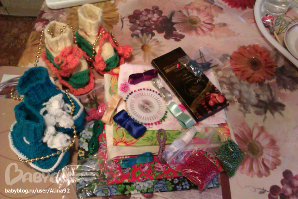Это был не обмен,просто девушка Марина душевно согласилась пошить моему будущему малышу пинеточки,я сообщила ей ,что шью игрушки!И когда шла утром на почту даже не думала ,что получу столько всего!!!Это фото всей посылки))