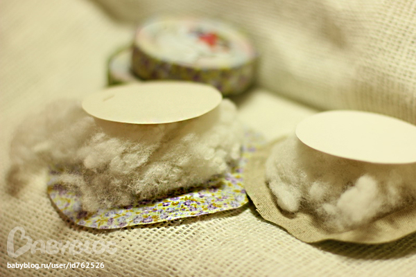 4. Из ткани вырезаем круг, на 1-1,5 см. больше диаметра крышки, кладем синтепон, а сверху картонный круг.