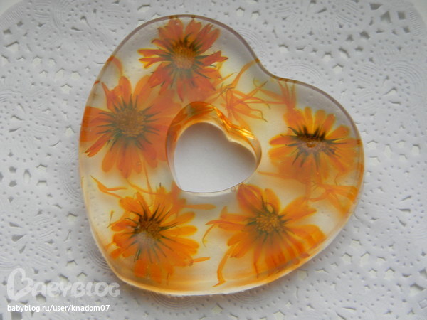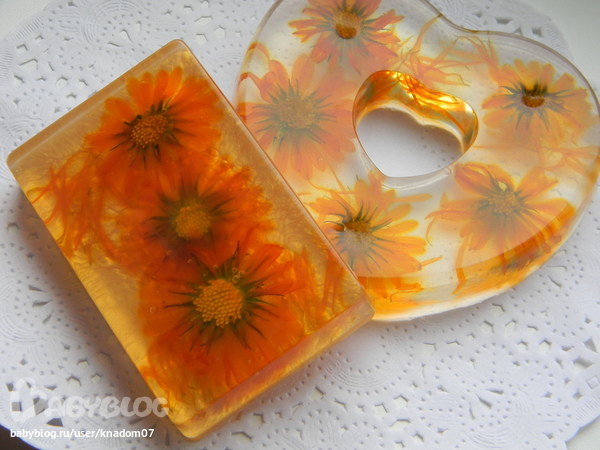 Спасибо! С сухой календулой делаю часто, с живой - проверю))) Летом делала с живой ромашкой - не потемнело, только немного как бы позеленело. С живыми цветами липы делала - темнеет. Вообще, почти все живые цветы будут темнеть, да и сухоцветы в большинстве тоже.