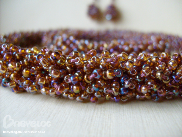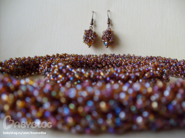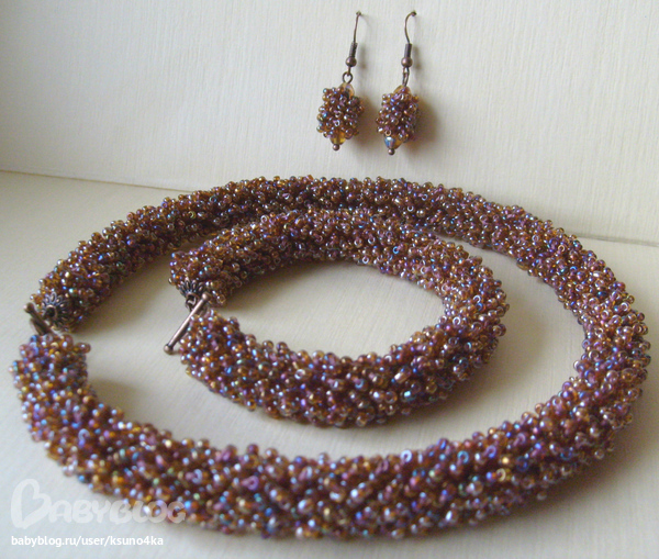 Комплект состоит из колье, браслета и серёжек. Я вязала его с мыслями о Наташеньке и очень надеюсь, что она будет носить свой комплектик, вспоминая меня добрым словом.