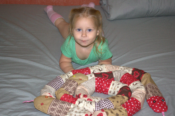 :) А шелухи не так много в них помещется. На 4 змеи ушла одна квадратная подушка. Даже чуть-чуть осталось шелухи на погремухи всякие.