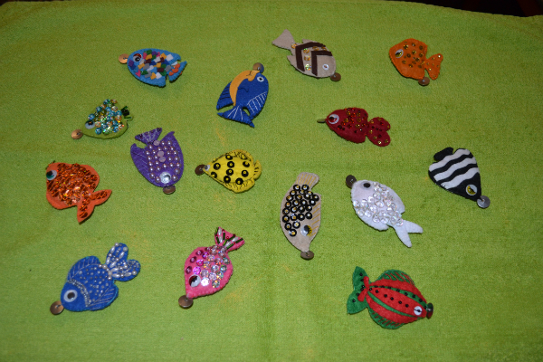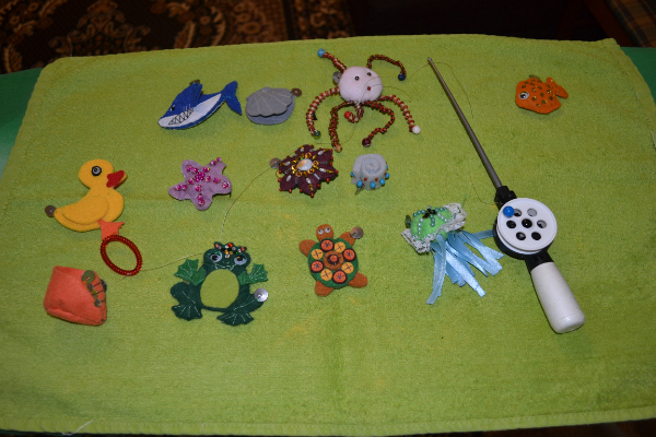 Поэтому я нафантазировала разных рыбок, достала фетр, разные бусинки/пайетки/ бисер и пр. материалы и сшила сама. В качестве удочки - настоящая удочка для зимней рыбалки. Крючок - круглый магнит. К самим рыбкам пришита обычная канцелярская кнопка. Рыбки с двух сторон одинаково расшиты. Изначально с глазами были все :) Рыбалка наша - исключительно сухопутная. сын в восторге носился с ней больше месяца. На данный момент поостыл, пока припрятала :)