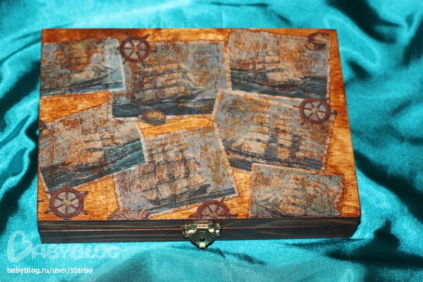 Это мой первый опыт и получилось кривовато конечно, салфетка вся буграми, но получился тот эффект, который я в принципе и хотела, как будто старинная шкатулка, которую обнаружили в каком-нибудь сундуке под слоем пыли. Шкатулка ошкурена, тонирована кофе и покрыта лаком. И хотела бы спросить у вас рукодельницы, тонировали ли вы дерево кофе и если да, то грунтовали ли дерево пере\д этим, или вообще надо было морилкой или акриловыми красками, что скажете?