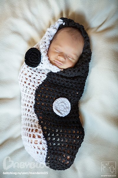 кокон сделан по размеру малыша новорожденного, просто сверху еще затянули веревочкой, чтоб облегало.