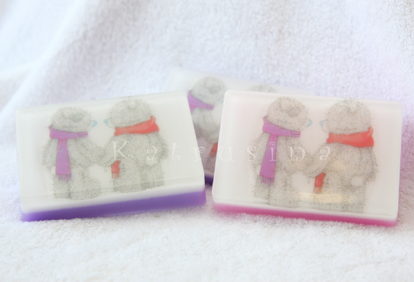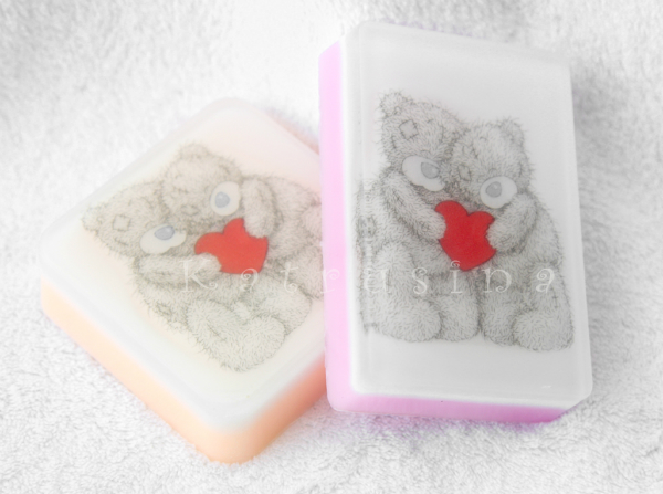 Катерина, прекрасное мыло!! Я вот тоже только только буду пробовать водорастворим.бумагу и честно пугали картинки с теддиками-много видела как будто серое пятно, а у вас....все четко и красиво! профи