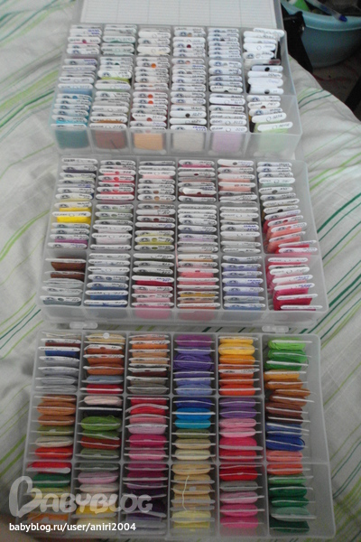 а когда вышиваю, те бобинки с мулине которые использую складываю в пластиковых конверты, стоят они 15 руб, а позволяют ничего не раскидывать