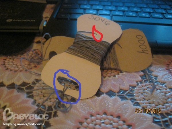 а вот что я придумала ; где красным -туда я прячу конец нитки чтоб неразматывался, а где синим- я туда привязываю остатки ниток.