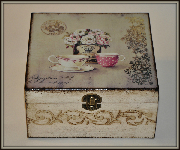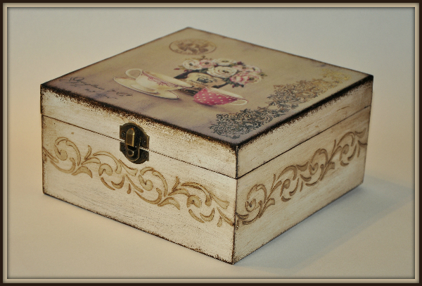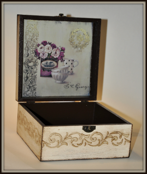 описание - шкатулку зашкурила и загрунтовала, внутри покрасила темно коричневым акрилом, снаружи сделала узор трафаретом и текстурной пастой, затем покрасила шкатулочку цветом слоновой кости, прошлась по поверхности губкой с битумом. Распечатки покрыла одним слоем лака, истончила и приклеила. Готовую шкатулку покрыла 5-ю слоями полуматового лака.