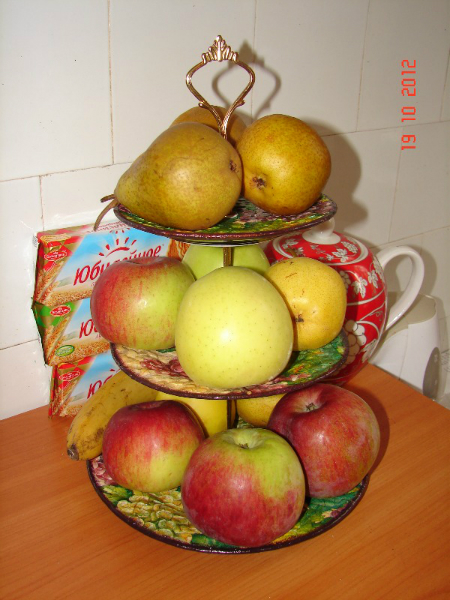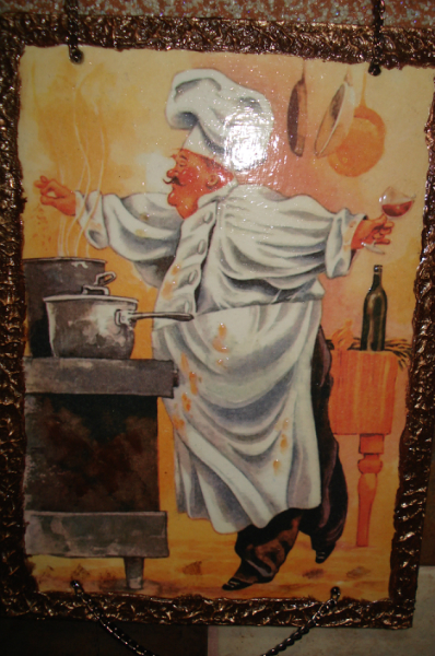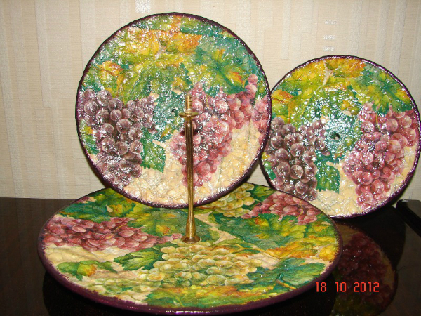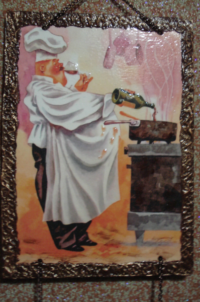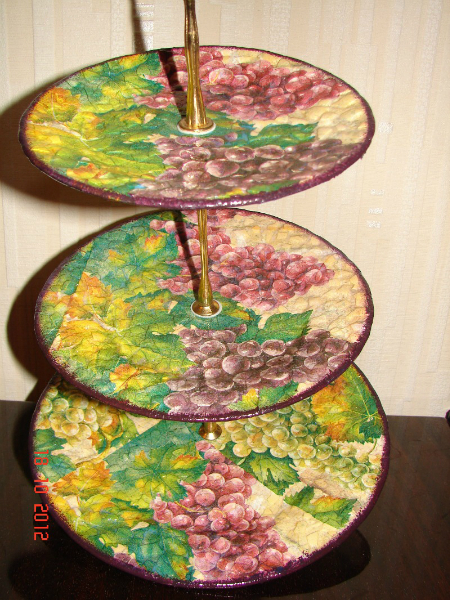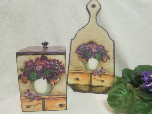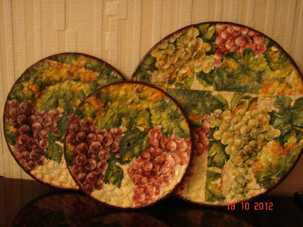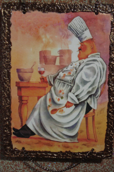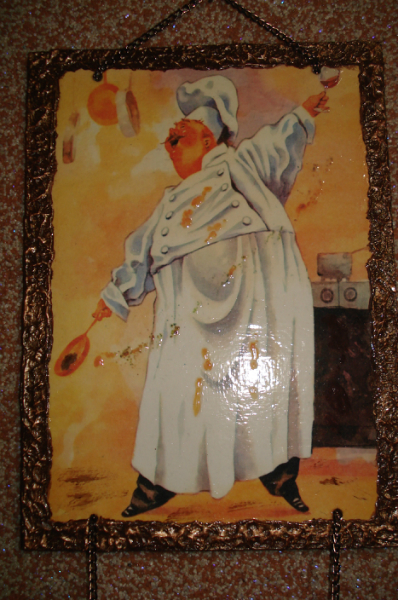 Блестящих, как покрытых лаком.Краткое описание используемых техник и материалов: деревянная поверхность табурета и разделочная доска, двухкомпонентный лак CREALL.,акриловые краски,пудра бронзовая ( бронзовка),мотив-3-хслойная салфетка. Использована техника декупажа на дереве. Конечно самый распрастраненный кухонный декупаж - это декупаж на кухонной доске.
