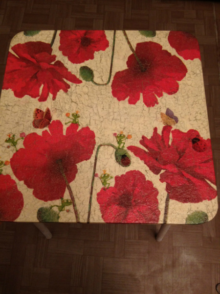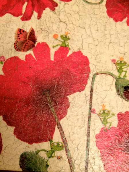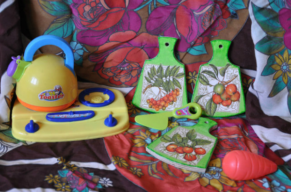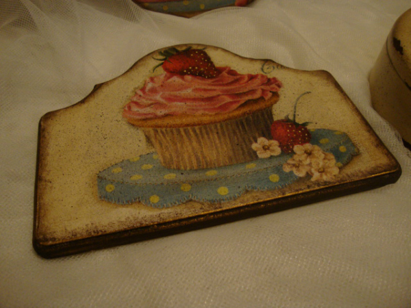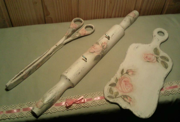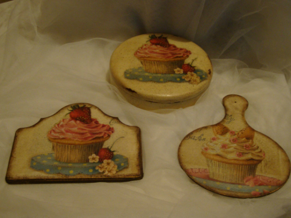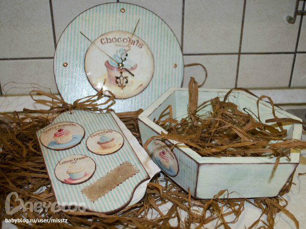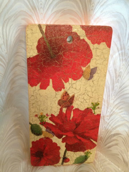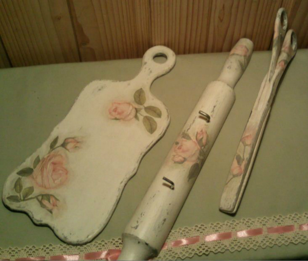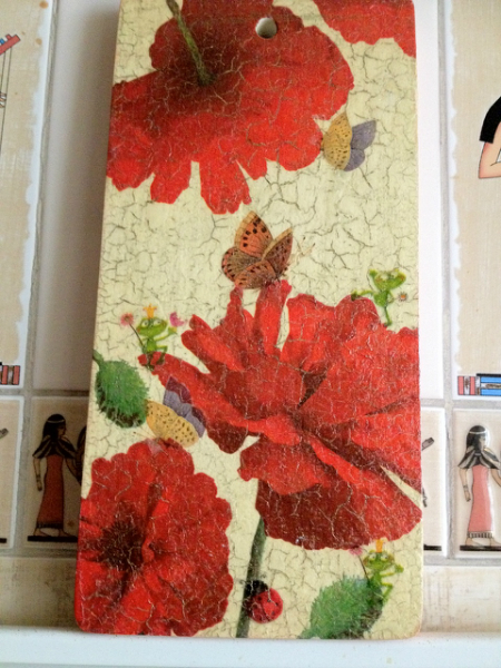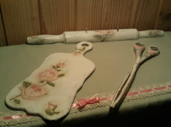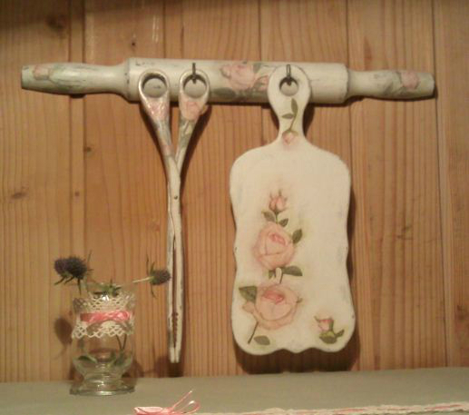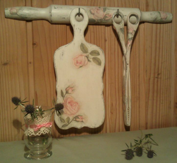 ход работы:загрунтовала досточки белой акриловой краской,приклеила мотивы из салфетки при помощи клея пва,покрасила акриловой краской,нанесла акриловый лак.
