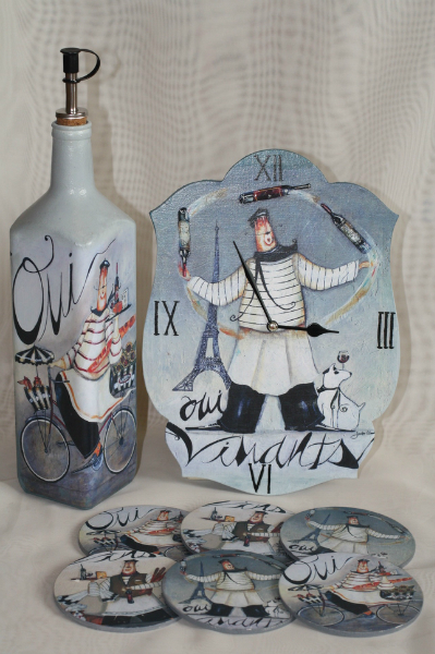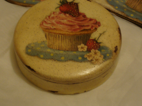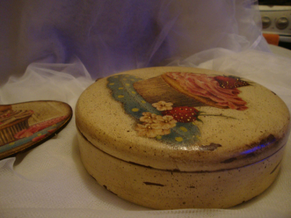 Прямой декупаж, контурная роспись, лепка из полимерной глины, состаривание кракелюром.