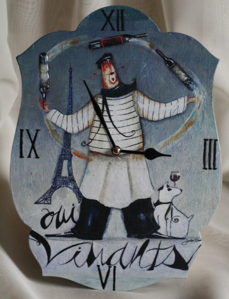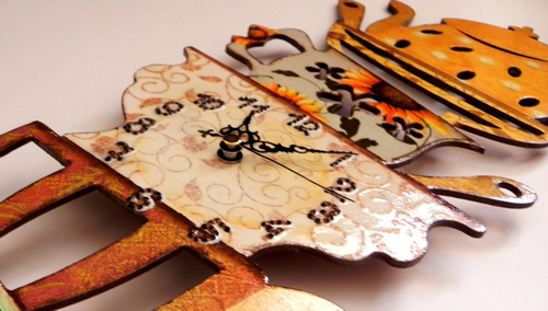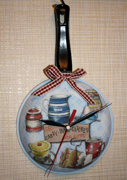 ход работы: загрунтовала аэрозольной грунтовкой для авто, закрасила голубой акриловой краской, приклеила салфетку, с помощью трафарета нанесла фоновый узор, сделала подрисовку и тени, покрыла лаком, муж просверлил отверстие для часов и вставил часовой механизм)