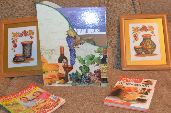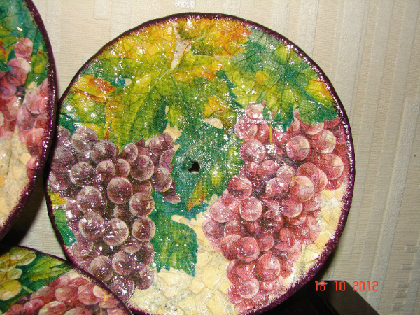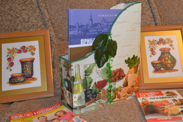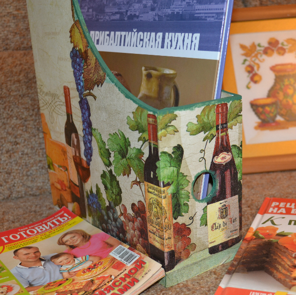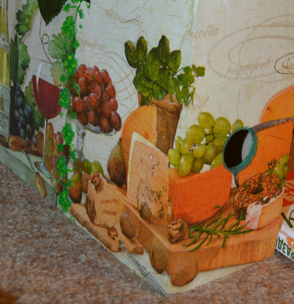 Взяла заготовку из ИКЕИ, прогрунтовала, приклеила мотивы от двух салфеток, чтобы швы не бросались в глаза, с одной стороны сделала орнамент из текстурной пасты со стеклянными шариками через трафарет и задекорировала искусственным листиком, с другой приклеила виноградные грозди из третьей салфетки, предварительно приклеив яичную скорлупу под них, добиваясь объёма ягод винограда. Осталось покрыть лаком и положить любимые рецепты. Приятного аппетита!