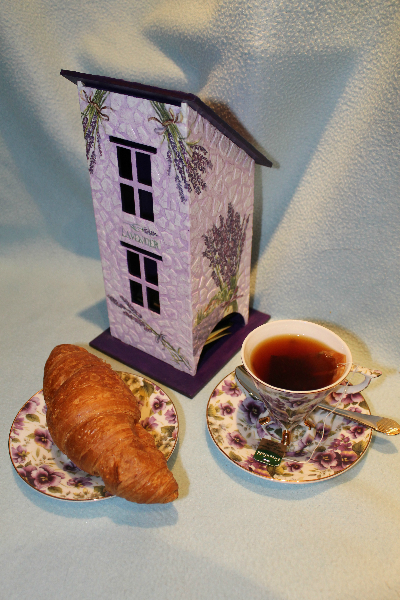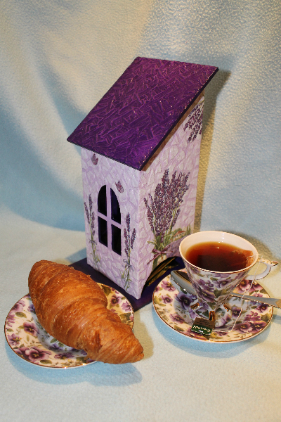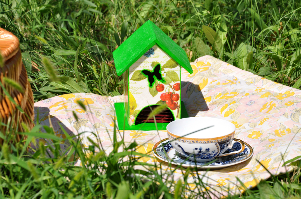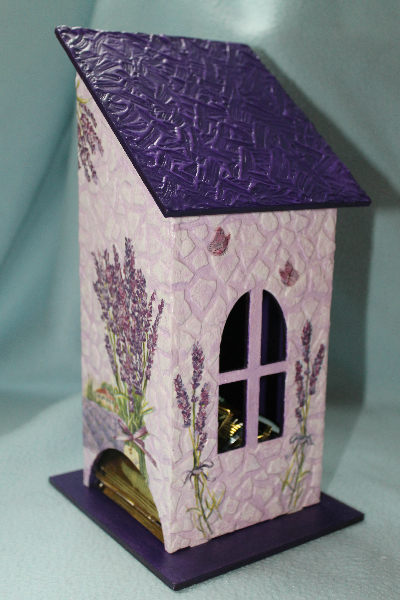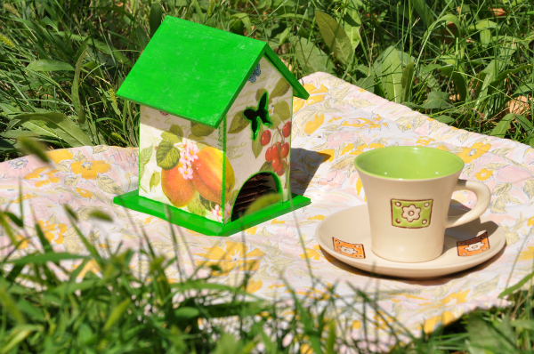 материалы:заготовка чайный домик,салфетка,акриловая краска(белая,зеленая),акриловый лак,клей пва.
