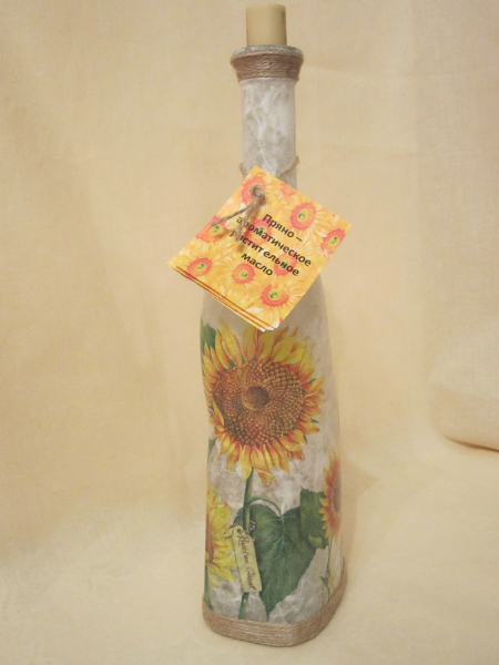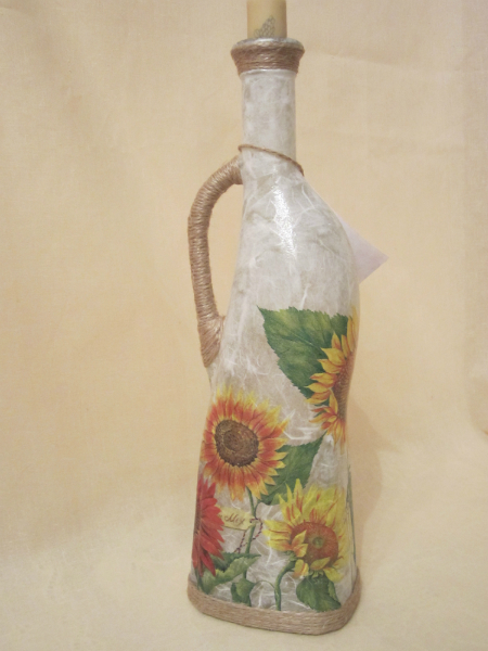 Материалы: бутылка, рисовая бумага, салфетка с подсолнухами, лак, акриловые краски для подрисовки, пеньковая веревка.