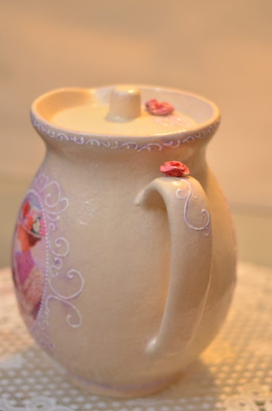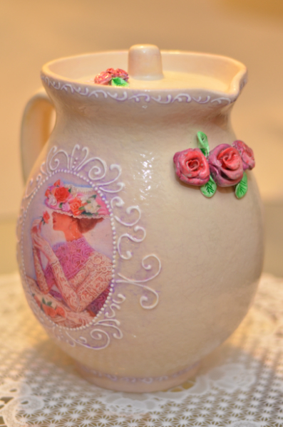 Материалы и техники: кувшин керамический, клей для декупажа, акриловые краски и лак, супер клей, лаковая распечатка,