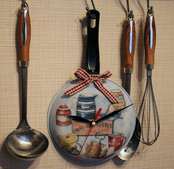 материалы: сковорода, автомобильный грунт, краски акриловые, трафарет, салфетка, матовый лак, часовой механизм и стрелки