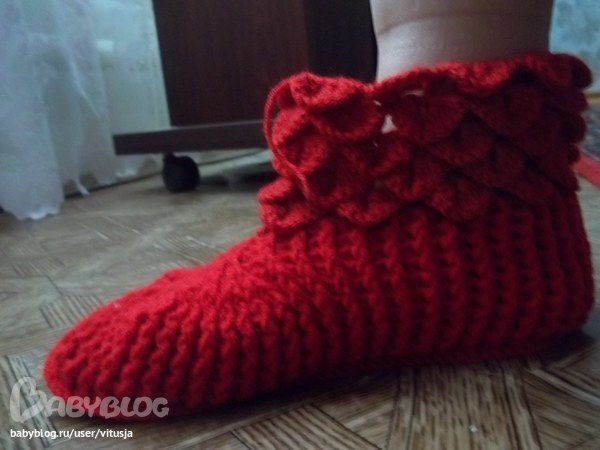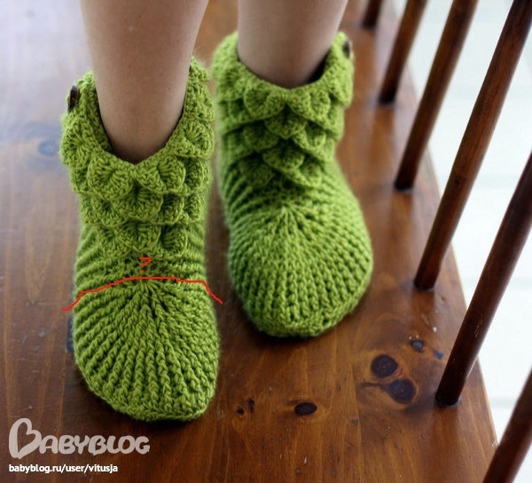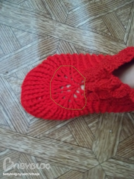 отчёт:связала пару красных крокодльчиков, но мне не нравится верх (на фото обвела жёлтым) очень стянуто и сильно ажурно, а в результате чешуйки начинаются не там и тянут верх ботика