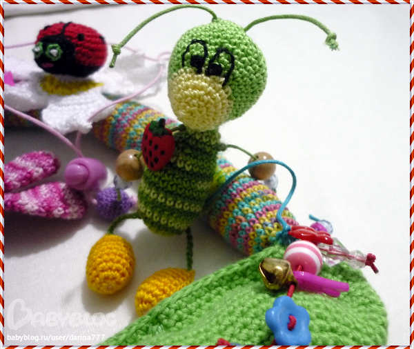 На длинном цветном стебле закреплен кузнечик кузя на спине липучка , " кузя " закреплен резинкой вместе с гусенице которая любит пролазить сквозь фигуры в листочке и прятаться в стручке, а так же у нее забавно бренчат бусины.