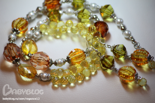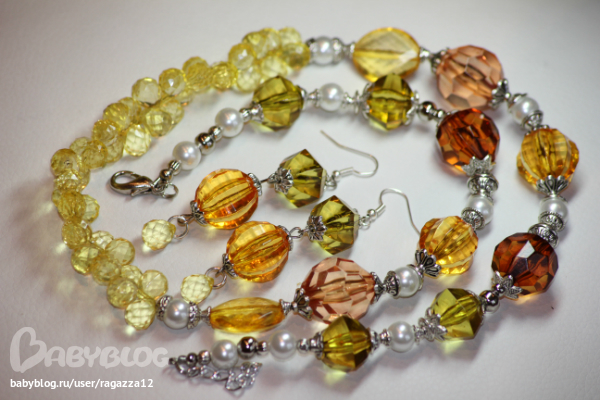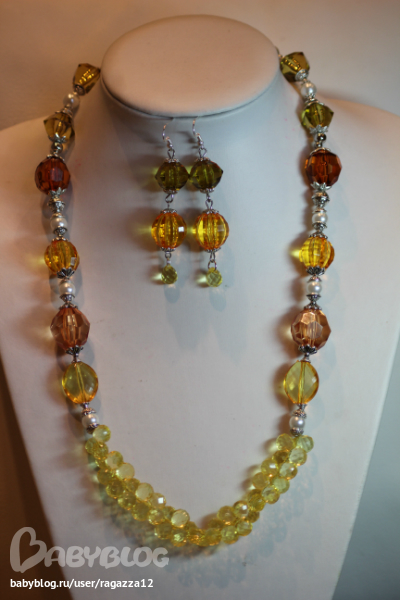 Низкие серые тучи,то дождь,то снег,то вообще не пойми что с неба падает.И вот захотелось мне чего-то солнечного,желтого и яркого.Сделала я вот такое колье и серьги.Яркий,красивый да и не дорогой получился.