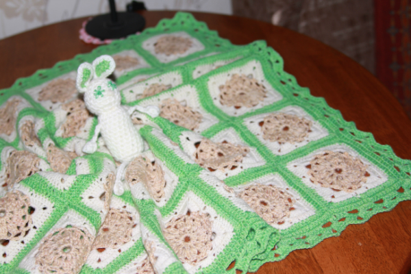 Уютный, мягкий плед для малыша или малышки) Прекрасно гармонирует со светлой коляской. Очень красивый и теплый. Накиньте плед на малыша и украсьте Зайкой - вот прекрасный кадр для семейного альбома. Зайка в подарок!